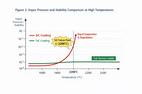 Oöverträffad termodynamisk stabilitet: Tantalkarbid (TaC) har en svindlande smältpunkt på 3880°C. Enligt forskning i Journal of Crystal Growth genomgår SiC-beläggningar "inkongruent avdunstning" över 2200°C - där kisel sublimeras snabbare än kol, vilket leder till strukturell nedbrytning och partikelförorening. Däremot är TaC:s ångtryck 3 till 4storleksordningar lägre än SiC, vilket bibehåller ett orördt termiskt fält för kristalltillväxt.